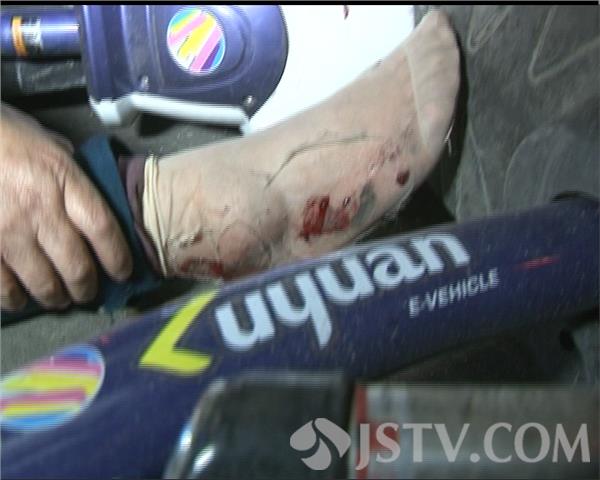 记者闻讯赶到时,女子坐在搅拌车的左前轮边,右腿不能动弹,右脚踝处被磨破,所骑的电动车也躺在搅拌车轮下。回忆事发时的一幕,骑车女子仍惊恐万分。