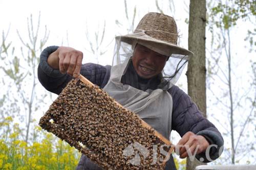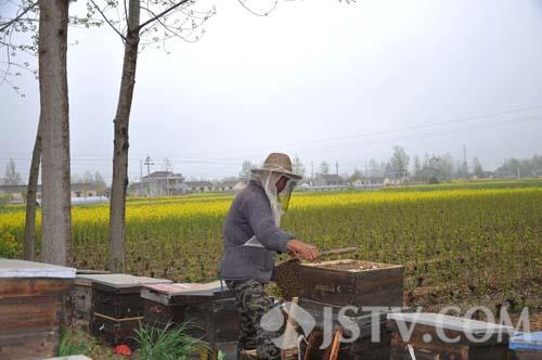 四月到盐城射阳,遍地菜花黄。4月20日,在江苏省黄海之滨射阳县新洋港畔特庸镇境内,一对外地口音,正忙碌着收取蜂蜜、采集蜂浆的“恋花”夫妻吸引了路人。
