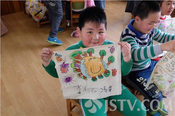 一批同学走进了幼儿园,用讲故事的形式教育孩子们要从小树立环保意识,如果平时不注意环保,到头来只能害人害己。生动的话语和逼真的表演博得了小观众们一片喝彩。随后,小老师们当即给孩子们布置了一个任务:在白色T恤上画出你心目中的地球。洁白的云朵、蔚蓝的天空、清澈的河流,这些原本应该随处可见的景象却只能存在于孩子们的想象之中。“有一刻我在替孩子们难过,如果现在我们再不去积极改善环境,那以后我们的孩子可能连蓝天白云的概念都没有了。”活动负责人吕铭语气低沉地说。每一幅画都表达出孩子们对地球母亲的喜爱和对保护自然、爱护地球的美好愿望。其中一位小朋友悄悄地拉着一名成员的手,表示她以后也要成为环境学院的学生,为保护地球母亲而努力。