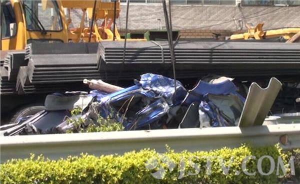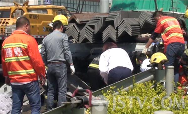 赶到现场看到货车车头被压在几十吨重钢材下,车厢内装着40多根长十几米钢材,这些钢材从车厢向驾驶室方向移动了近2米多,货车严重变形,驾驶室被压在刚才下扭曲变形,风挡玻璃碎了一地,两人被卡在座椅和控制台间,目击者透露,前车突然刹车,后面货车也紧急刹车,这才导致钢材冲毁车上挡板将驾驶室冲毁,有两人被困。