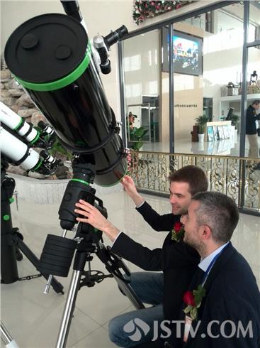 据介绍,该项目引进美国、日本等最先进工艺流水线30多条,专业从事研发、设计、生产高端天文科普望远镜、多功能数码望远相机等,运用电子传感技术和远程遥控技术的望远镜,只要坐在如皋,就可以通过互联网连接到远在西藏天文台的望远镜,观看天空星云。在偌大的厂区,记者看到,来自美国、加拿大、法国、德国、意大利等全球30多个国家和地区的天文爱好者聚在这里,交流感受,切磋技术。来自美国的凯文和杰夫对星达望远镜赞叹不已,他们说,“星达”一直在创新,一直在进步,引领天文望远镜的潮流,所以,用“星达”,是他们永远的选择。