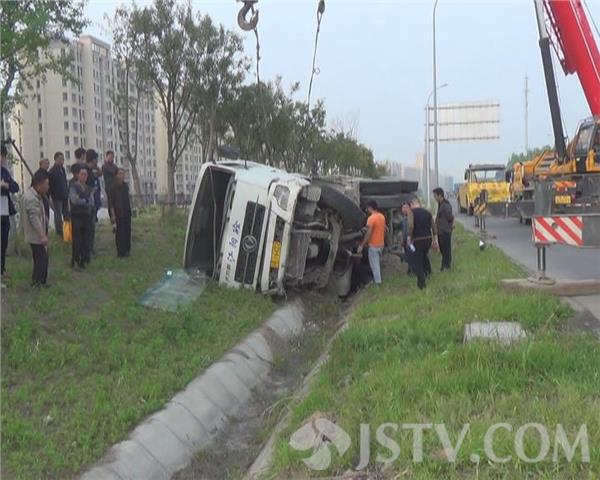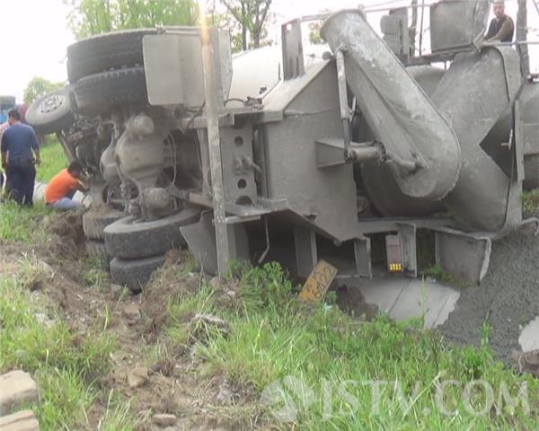 今天下午一点多钟,在新328国道与望江路交叉口东北角40米左右,一辆搅拌车行驶到这里,突然方向失控冲进路边路坎发生侧翻,所幸驾驶员没有大概,目前具体事故原因还在调查中。