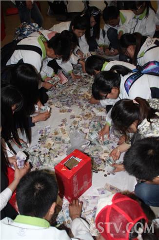 超市门前的大学生们依然还在募捐,直到晚上9:30分,在淮安市区万达广场,金马广场,多家超市广场前募捐的大学生们汇合集中来到医院,在医院大厅大家将七只募捐箱全部打开进行清点,经过大家清点共筹集到30109.9元,随后由7名大学生代表带着街头筹集到的爱心善款来到病房亲手交给刘欢的妈妈,以为爱心女士还当场捐赠了1000元钱。善款最终为31309.9元。