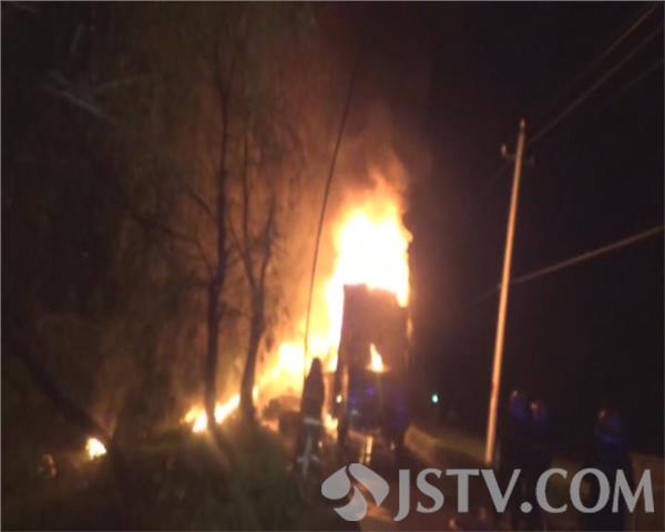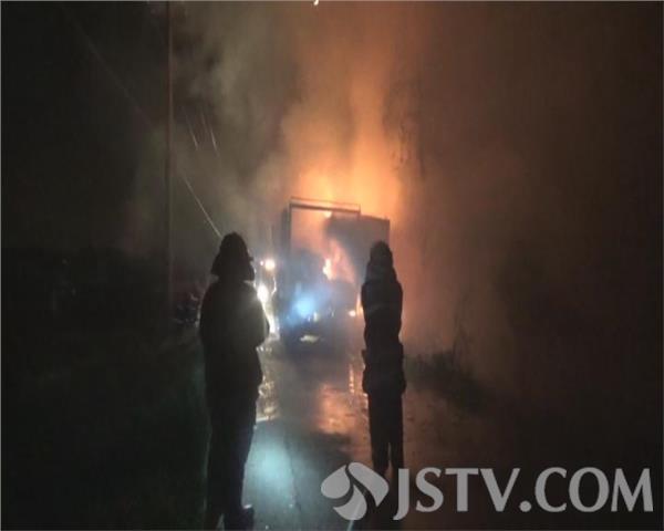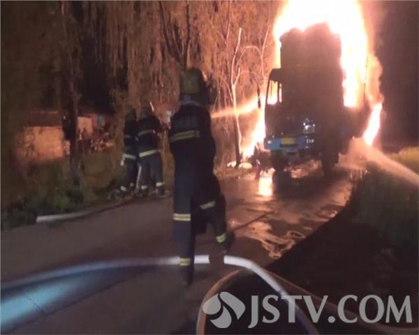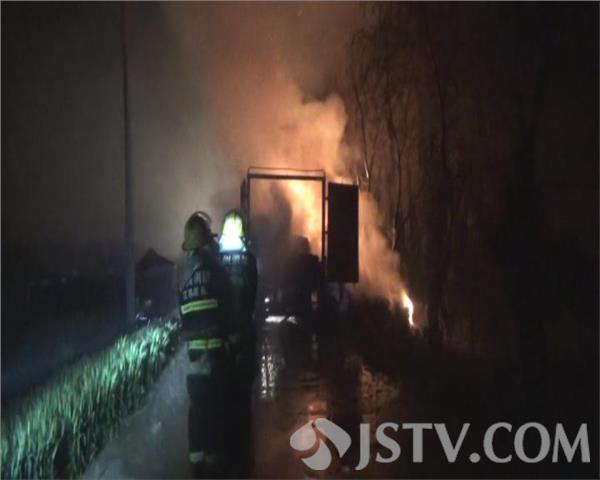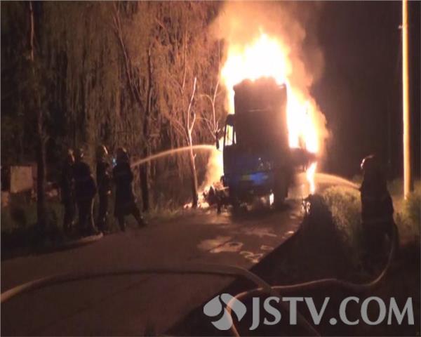 4月24日晚上8点30分左右,扬州市杭集镇龙王村附近,一辆装有2吨棉料的货车起火,司机使用灭火器自救未果,火势迅速蔓延,当地消防部门接警后迅速赶往现场扑救。