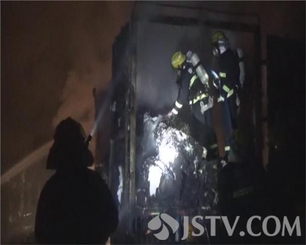 据货车司机介绍,车上装载了两吨棉花下角料,用来制作一次性拖鞋的,当时车子停在路边等老板,开往南通。突然发现车子右后侧着火,用了两罐灭火器自救,但火势太大,没有灭得下来,这才报警求助。