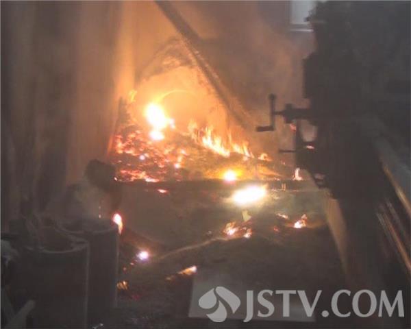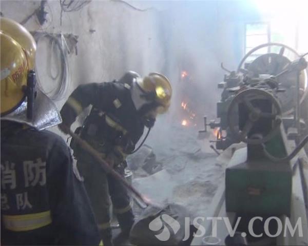 现场可以看到,厂房内部黑烟弥漫,墙角处堆放的镁条渣燃起大火,扑闪扑闪,出强烈的白光和热,引燃房顶,火势向旁边机器蔓延。