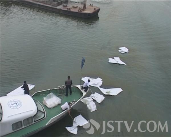 报警的市民王师傅说,这条长长的油污带,长几公里,宽80米左右,是昨天傍晚6点多钟的时候从滁河的上游漂来的,应该是柴油。很快,海事部门工作人员开着执法快艇来到现场,他们正在往油污带上抛吸油毯,环保部门工作人员也在对油污带取样,准备带回去对滁河水质进行化验。
