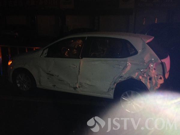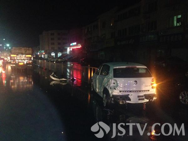 记者赶到现场时看到由南向北的路东边有一辆大货车停在十字路口北边,后面有一辆白色的大众轿前后都被撞了面目全非,地上到处都是塑料碎片,在大众轿前面有一只被撞坏的保险杠,在护栏外面的现代轿车车门被撞了凹了进去。
