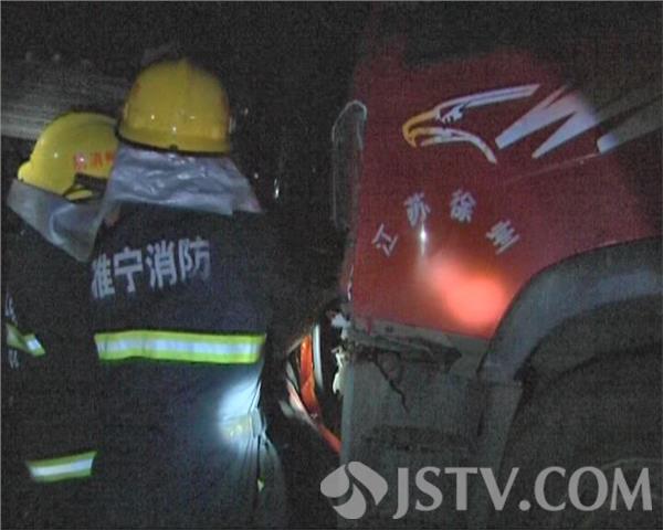 昨天晚上10点多钟,徐州睢宁县官山镇104国道上,一辆载有两辆小货车的大货车撞到一名路人后,急打方向后擦到了路边的大树发生侧翻并向前滑行。由于货车车速过快,侧翻滑行中正好撞上了对面正常行驶的半挂车。货车司机被困驾驶室。情况紧急,睢宁中队立刻赶赴现场实施救援。