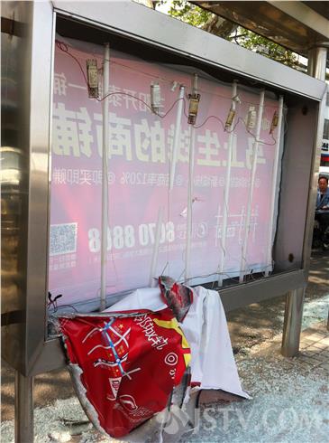 由于男子的这一行为,不仅仅给许多在这个站台乘车的市民带来了不便,更让一名无辜的过路老人受到了伤害。就在今天凌晨4点半左右,一名骑三轮车的老人由于视线不佳,没有看到满地的玻璃渣,在路过站台的时候摔了一跤,导致老人的双手和额头均不同程度的被玻璃渣割伤、摔伤。