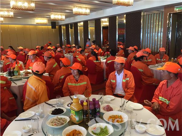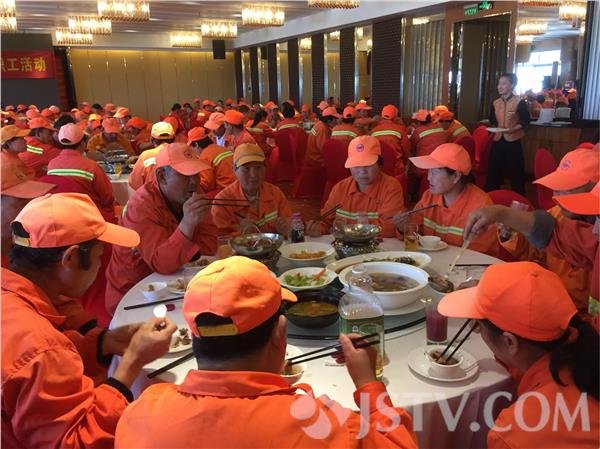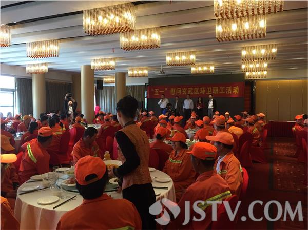 今天中午11点半,记者来到南京的一家酒店,与以往不同,今天,光顾这家酒店的是一群身着橙色制服的保洁员,他们全部来自南京玄武区环卫公司。环卫工人吃的都比较开心,这么大的场面还是第一次。