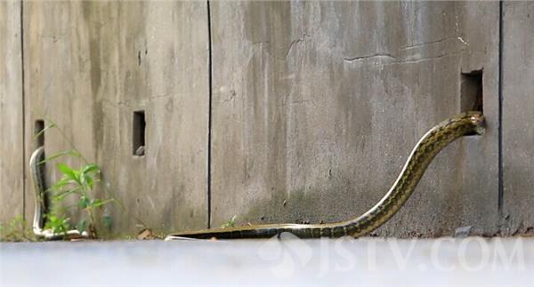 今天下午,镇江句容一市民在自家小区的水泥路面上发现两条近2米长的大蛇。当时,两条蛇缠绕在一起,每条蛇都有小孩手腕粗,当发现有人靠近,这两条蛇迅速分开,其中一条慢慢钻进了旁边围墙的雨水洞里,另一条则爬上了近一米高的陡墙,钻进了绿化带里。