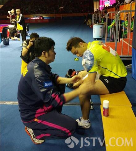 伤口没有打封闭,作为国家队总教练的刘国梁赛场也一直为许昕做放松按摩,希望能减轻他的伤痛。