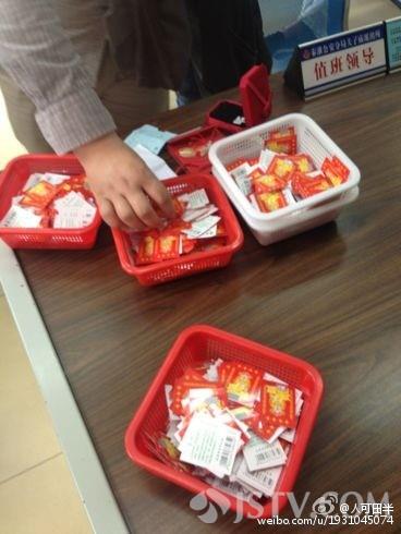 这两个篮子就是从滇西宝藏店内柜台里拿出来的,一个篮子是红色的一个是白色的,那么里面的奖券有什么不同呢,我们刮开看看,发现红色篮子都是一等奖,而白色篮子都是谢谢惠顾。知情人表示,商家就是利用顾客希望中奖的心理,骗取顾客高价购买低档玉器。