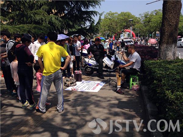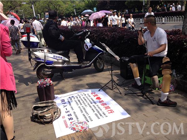 昨天是“五一”小长假第一天,天晴好温度适宜,下午前来南京玄武湖景区游玩的游客人山人海,为赚取生活费,双腿截肢的残疾小伙来到人流密集的玄武门展览馆前唱歌卖艺,不过他的行为违反了南京市城市管理有关规定,看到艺人双腿残疾,城管文明执法,耐心劝导无效的情况下,与残疾卖艺小伙用高音喇叭“对峙”,当时引起不少游客围观。