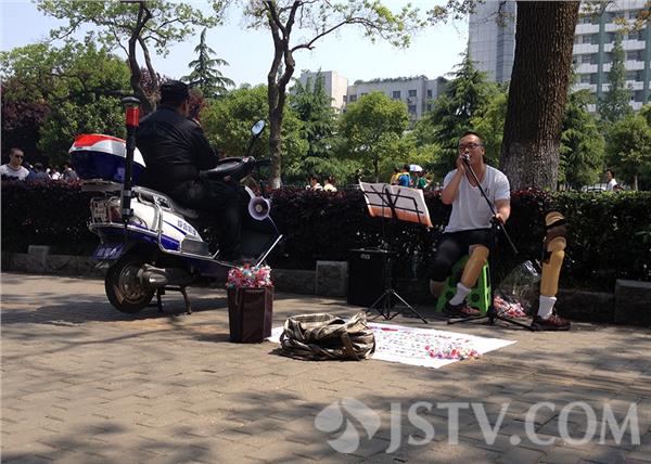 下午2时许,笔者到南京玄武湖游玩,在玄武门展览馆门前北侧的道上看到,一位上身穿白色T恤裸露假肢的年青小伙,手抓着麦克风的小伙尽情的歌唱,而在他的一侧,一位穿黑色制服的城管,向另一侧观望,不过小喇叭里不停放着“请遵守城市管理,自觉维护景区环境”,为了对抗城管的“干扰”,残疾小伙调高了音响,把城管的高音淹没在他的音乐里,双就这一直对峙着,时长达半个多小时,引起不少的游客围观。