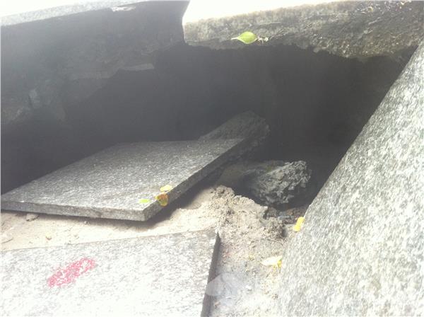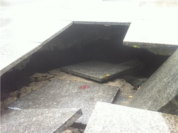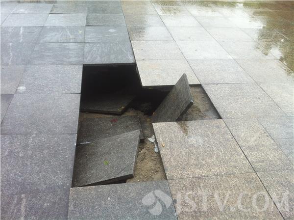 “我就踩的这块,我刚过去,这边就塌了,我吓一跳” 家住南京三牌楼附近的刑先生见到记者就激动的说了起来,原来他今天上午十点去菜场回来就碰到了塌陷。记者看到,三牌楼市民广场中间有四五块大理石已经完全塌陷了,目测里面的空洞至少有两米多深,而且旁边的大理石也有塌陷的现象。附近的居民告诉记者,这里已经是第二次发生这种情况了,这广场上的大理石颜色有两种,一种是黄色,一种是黑色,黑色就是上次也发生过类似的塌陷,重新铺上去的。