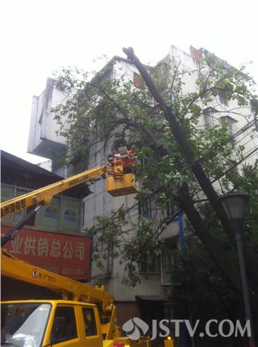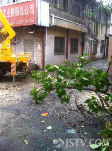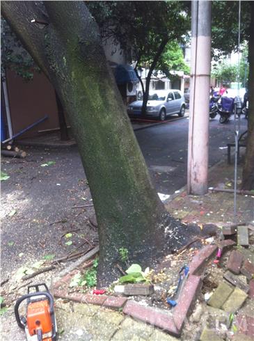 接到居民举报后,新街口街道和玄武园林工作人员赶到现场处理。玄武园林工人先乘升降车把这棵树锯成一段一段的,消除安全隐患 ,然后把锯下来的这些树先堆到路边,恢复小区通道通行。据了解,这棵大树品种是泡桐,至少生长二十年了。突然倒伏,是由于这个品种本身根就扎得浅,再加上昨夜的阴雨大风,使得整棵树更加不稳固。目前,新街口街道工作人员正在排查其他小区类似安全隐患。