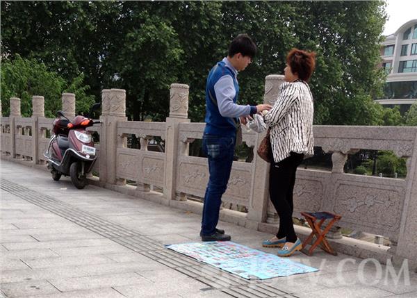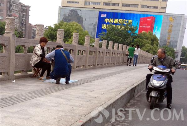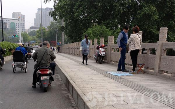 笔者今天下午来到汉中门大桥,果然在汉中门大桥南侧人行道上看到,一个穿白上衣黑裤子,短发的中年女子坐在小橙子上,摆地摊,在她的前面铺着一张广告纸,上面写道回收高档玉器,在她的右侧,旁边还下蹬着一个背包的小伙,此时她们看到有一位老人骑电动车从西面远处驶来,小伙子立即从包里拿出来一个玉佩和一副玉手镯说:“偷来的玉器绝对正宗便宜卖”,老人家好奇停下车观看,这时另一个躲藏在远处的小伙骑电动车假装行人赶来围观,演双簧说:“这真是一块好玉”,随后小伙1300把玉佩卖给了该女子,但是另一副玉镯800块始终不肯卖给她,走路向东离开,此时如果有人贪便宜心动,追上去加一点钱,哪要中她们圈套,受骗上当了。