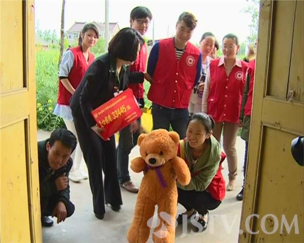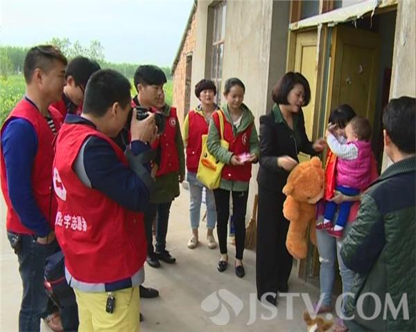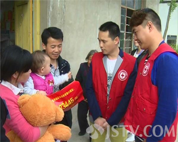 5月4日的下午,响水县红十字会志愿服务大队组织部分青年志愿者,到该县小尖镇看望才十七月大的白血病患者小智慧,他们除了给小智慧带来了玩具,还将这几天来募集到的33445元善款交到了小智慧父母的手中。