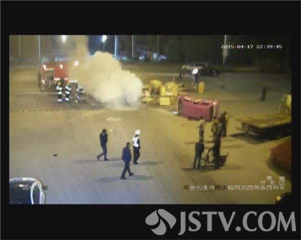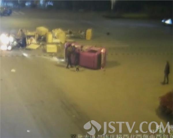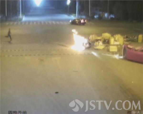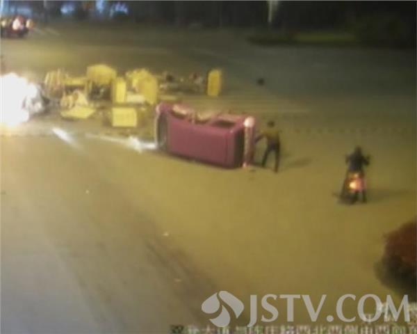 这是路面监控拍下的画面,4月17号晚上10点14分,一辆面包车由东向西经过泰州姜堰区双登大道和陈庄路的十字路口,一辆满载货物的三轮摩托车快速驶来,两车发生碰撞后都侧翻在了马路上,然而让人意想不到的是,10秒钟后,三轮摩托车突然起火。当时车里一共有6个人被困,包括2个小孩。所有人都被困在了车内,意识也有些模糊。就在这时,正好有一辆电瓶车经过,看到事故发生之后,车上的一男一女立即靠边停车,骑车的男子上前首先拉了拉后备箱的门,发现无法打开之后,绕到了面包车中间,从破碎的车窗中抱出了一个孩子,随后面包车里有人起身,将另一个孩子送了出来,而这名男子一直在协助车内的人员脱困。十分钟后,交警和120救护车赶到现场,将受伤人员送往医院救治,交警拿出灭火器控制火势。10点38分,消防车赶过来扑灭了大火。