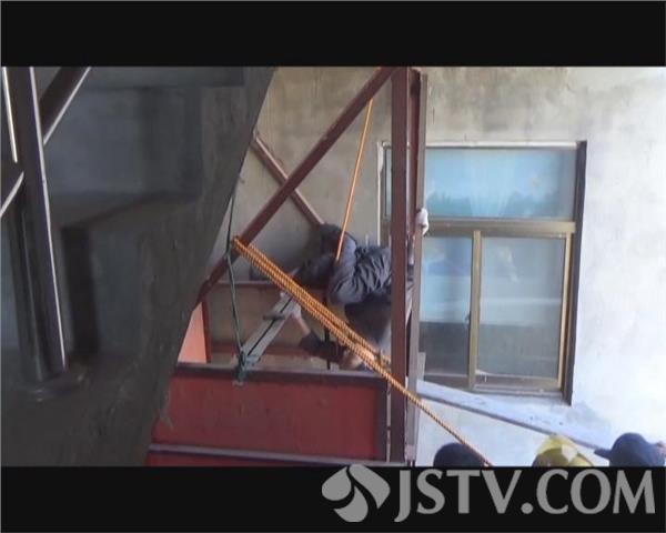 5月12日上午10时,盐城市沟墩卫生材料厂内,一名工人在利用电梯井送货的过程中,电梯井钢索突然断裂,男子不慎从三楼坠落卡在了电梯井支架上。接到报警后,当地消防部门随即展开救援行动。