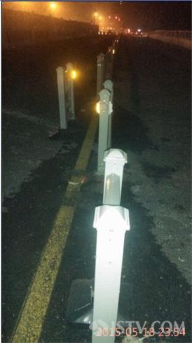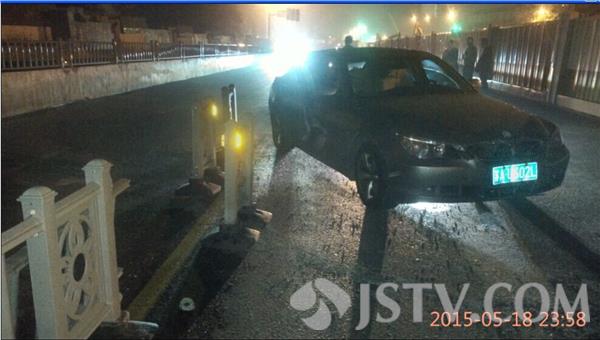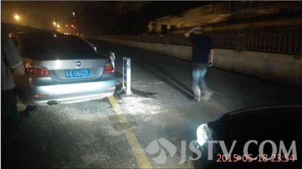 5月18日晚上11点半钟,在南京北京西路与云南路交汇的路口东侧,南面道路上,一辆疾驰的小轿车,似乎是失控,冲垮了道路中间的护栏,停在对面车道上。车辆前方受损,不能行驶了。道路中间被冲垮的护栏有5节,10多米,现场一片狼藉。