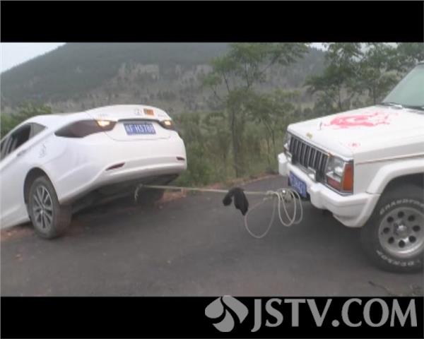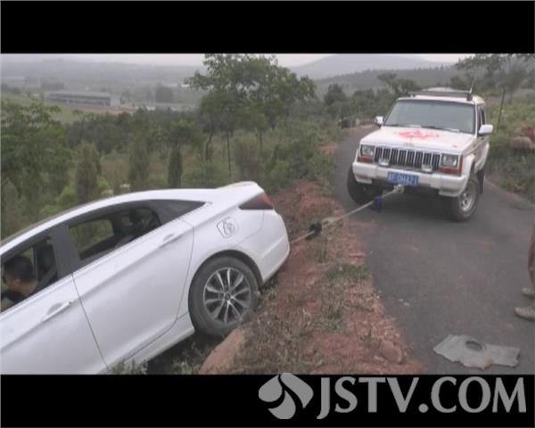 5月19日17时39分,徐州市贾汪区督公山滑雪场北面,有车辆冲出盘山公路,搁浅在斜坡上,随时有滑下山坡的危险,当时现场的有好几辆车的司机,看到这种情况纷纷停车前来帮忙,指挥员想出了用车辆牵引将轿车从坡上拉出来,但是消防车太大无法上山,只好借用了热心人的吉普车,将两辆车用安全绳连接在一起,这还需要经验丰富的老司机来驾驶被困车辆配合牵引。大约过了20分钟,被困车辆被牵引了出来。
