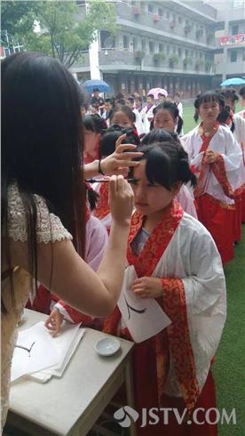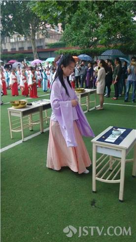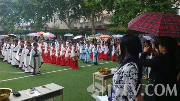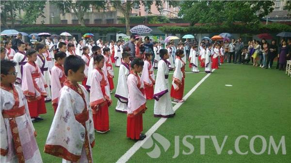 今天(5月27日),南京汉口路小学的操场热闹非凡,三年级学生个个身着汉服,在此接受老师和家长为他们举行的“懂礼仪 承传统 胸怀梦想茁壮成长”意义特别的集体十岁生日成童礼。