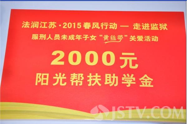 “六一”前夕,江苏省司法厅与江苏省监狱管理局共同举办“法润江苏?2015春风行动——走进监狱”服刑人员未成年子女“黄丝带”关爱行动集中活动。“江苏阳光帮扶基金”向10名服刑人员特困家庭未成年子女发放2000元的助学帮扶,向参加帮教活动的其他服刑人员未成年子女赠送学习用品,服刑人员亲属代表、服刑人员代表交流发言,40余名服刑人员未成年子女及亲属参加“黄丝带”面对面的亲子会见。