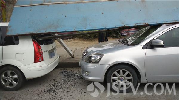 经过进一步了解,原来是当天下午,这辆运送黄沙的货车司机在倒车的时候,不小心刮到了站台的一角,由于站台根部本来就已经生锈,结果就发生了站台倒塌砸中两辆轿车的事故。起初货车司机不成认自己刮到了站台,交警在其车尾部找了了刮痕,司机不得不承认了是自己刮倒的事实。