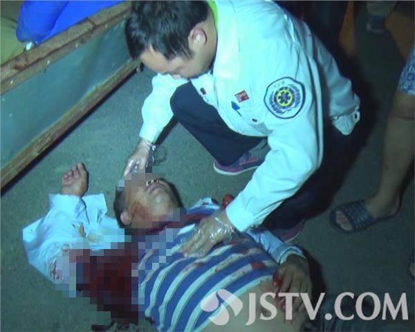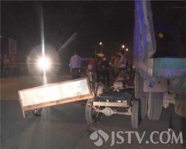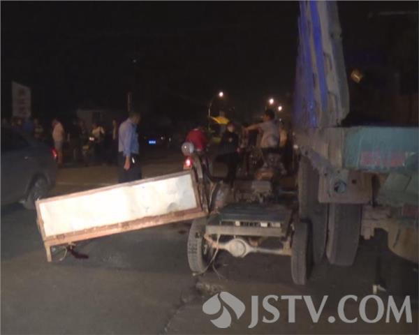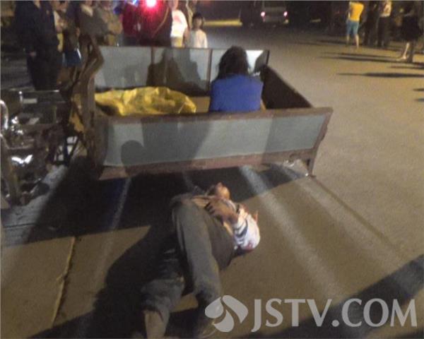 今天晚上(5月28日)9点多钟,一辆三轮摩托行驶到扬州滨江花园小区门口附近时,迎面来了辆货车灯光较强,影响三轮摩托视线,三轮摩托驾驶员没有注意路边停着辆卡车,一下钻进卡车尾部。随后从后左轮部位穿出车外,三轮摩托两人受伤,其中男子倒地流血昏迷不醒。