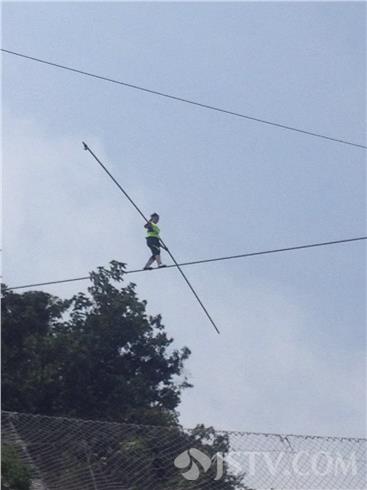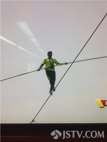 根据规则,今天是直走竞速赛,7位选手根据抽签的顺序,先后无保护在钢丝上向前跑步,走完钢丝用时最少的前两名选手将晋级第三天的蒙眼倒走钢丝总决赛。