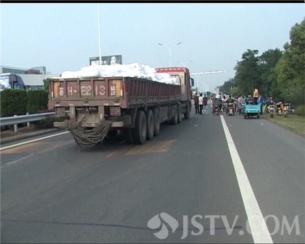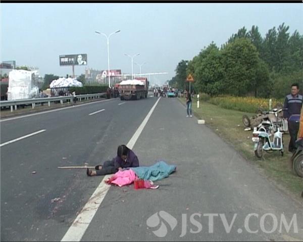 事故发生在淮涟公路涟水县一中门前,记者赶到现场时看到,公路南侧的车道上停着一辆半挂货车,在货车后方大约一百米开外的地上,躺着一具女孩的尸体,女孩的奶奶趴在一旁痛哭。旁边的绿化带里,有一辆被撞坏的三轮车。据了解,傍晚5点左右,夫妻俩驾驶自家的电动三轮车,从淮涟公路自西向东行驶,当行驶到该路段时,突然被后方同方向行驶的一辆货车撞上。