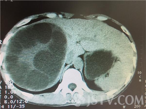 昨天,记者在医院见到了手术后的母女士,她术后恢复良好。32岁的母女士祖籍云南,10多年前来到南通。一个月前,她突然感到右上腹胀痛不适。医院通过CT检查,发现导致母女士腹部膨胀的原因是肝右叶上的巨大肿瘤,推断是患上了肝包虫囊肿。这种病主要流行于畜牧业发达地区,在江苏极为罕见,可能与母女士的饮食卫生习惯有关。