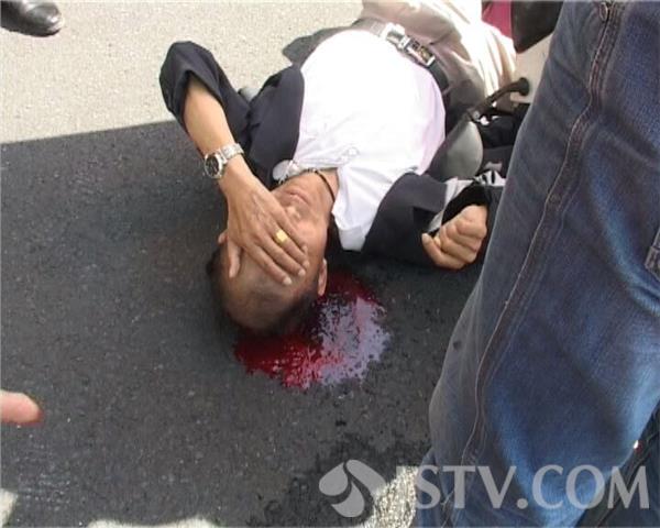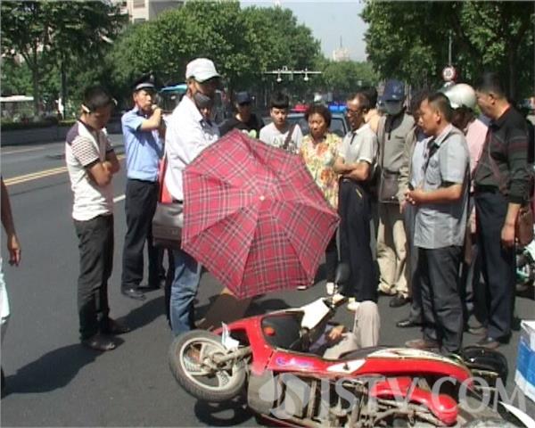 现场据目击市民称,当时董某骑车载货,由东向西方向在快车道上快速骑行,不巧刘老汉(被撞受伤者)反道骑车过来准备过街向南,董某躲闪未及,一下子迎头撞了上去,刘老汉被撞瞬即倒地,后脑着地大量出血。而董某也吓懵了,很长时间才反应过来。幸好当时一好心市民杨某路过,见伤者还在太阳下暴晒,赶忙拿出随车雨伞给伤者遮阳。民警随即联系120急救,不久120快速赶至,将伤者刘某送至附近长征医院紧急救治。