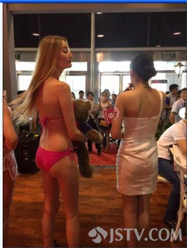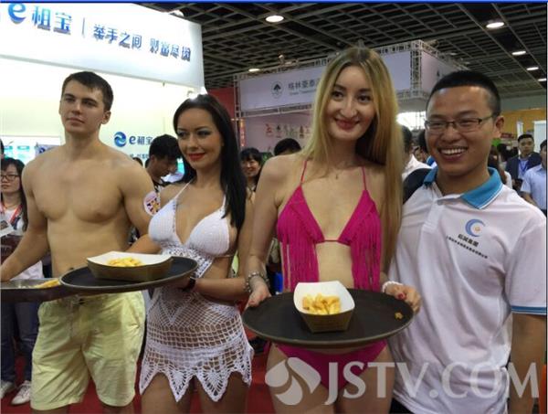2015年第七届投资理财金融(南京)博览会今天(6月12日)上午在南京新庄展览中心开幕,中午,展览大厅一角异常热闹,一家销售炸鱼薯条的商家,聘请了3位模特,穿着三点式,端着炸鱼薯条,分发给市民免费品尝。