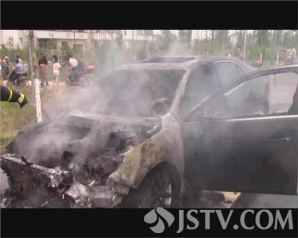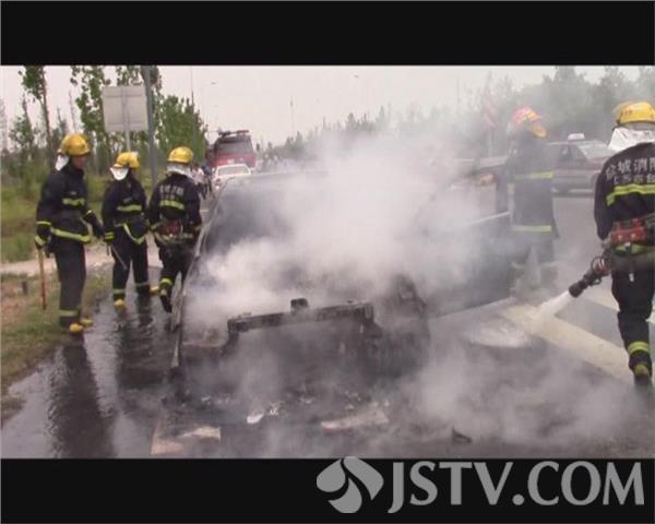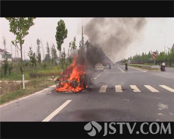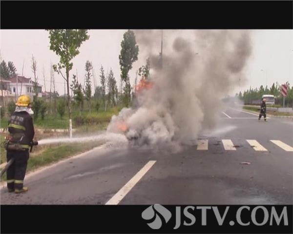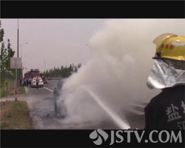 6月14日14时,盐城市东台城东新区,一辆行驶中的轿车突然从发动机部位燃起了火苗,由于随车没有配备灭火器等设备,司机停车后随即拨打报警电话求助。