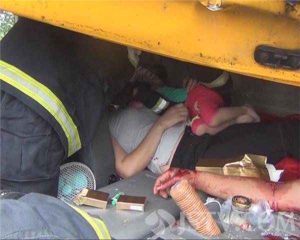 现场可以看到,事发路段车辆堵成长龙,一辆黄色快递货车撞上前方拖载新车的半挂货车。快递车车头受损严重,车内一男一女两个大人被困,其中还有一名大约三岁大的小女孩。男司机伤势较重,头部鲜血直流。后排一名女子躺着被卡,手上抱着女孩。消防队员钻进驾驶室,将女孩先抱出。