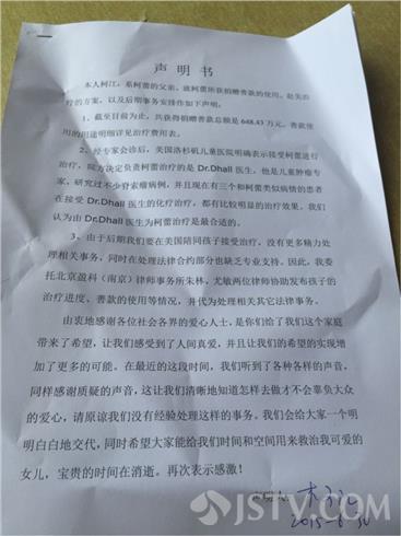 柯蕾爸爸柯江连夜拟出声明,约谈荔枝新闻记者想谈孩子的治疗。
