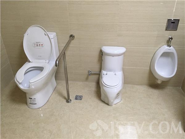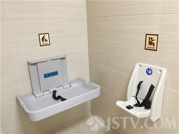 婴儿护理台是折叠式的,给婴儿换尿布时可以放下。婴儿等待座椅,就是家长在上厕所的时候,可以把孩子放在上面。婴儿护理台对面依次排列着专为宝宝设置的微型坐便器、小便池和洗手台,十分可爱。而无障碍坐便器前面就是洗手台,洗手台两侧有无障碍栏杆可供行动不便的游客使用。