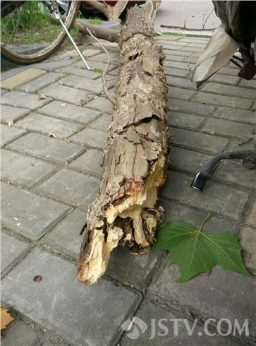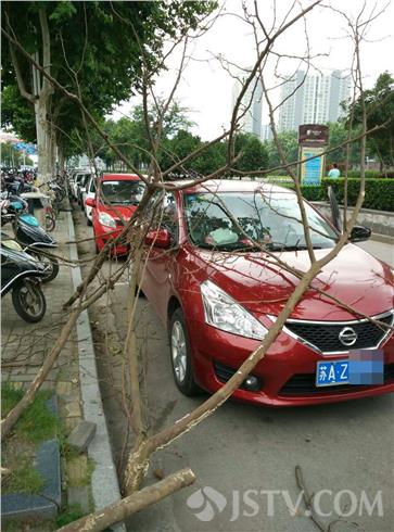 根据预报,超强台风“灿鸿”即将来袭,届时(傍晚前后)“灿鸿”将携带庞大的螺旋云系过境江苏,就在今天(7月11日)中午,南京桥北已先期领略到了强风来袭前的风头前阵,位于大桥北路边的数棵法桐的树枝遭大风折断,树枝掉落后砸坏了停靠路边一辆红色尼桑轿车及3、4辆电动车。