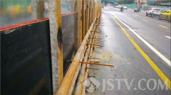 记者小心翼翼地走在狭窄的人行道上,汽车,特别是庞大的公交车,有的时候就贴着记者的身体呼啸而去。而正在建设的围档外侧,记者看到,有很多10多公分,20多公分长的钢筋,就裸露在外面,对着人行道。