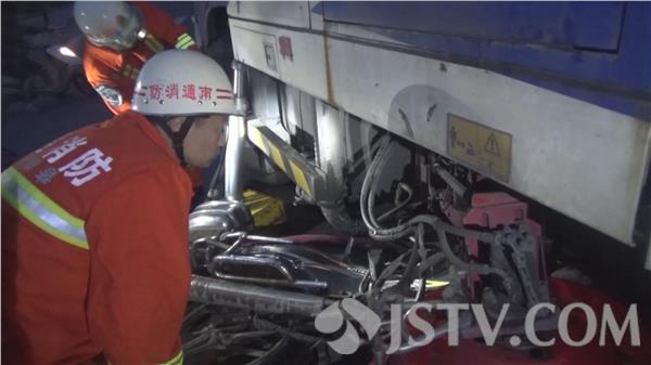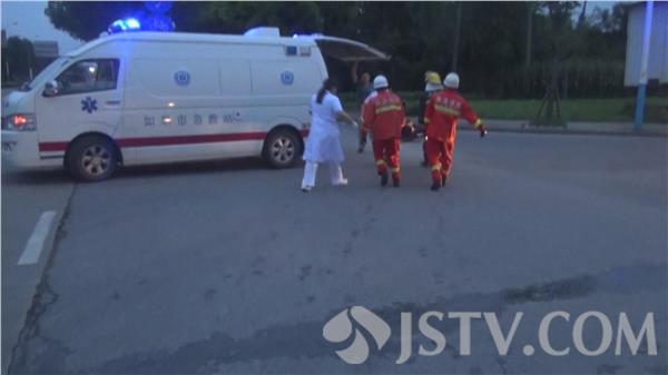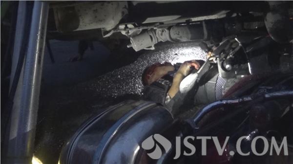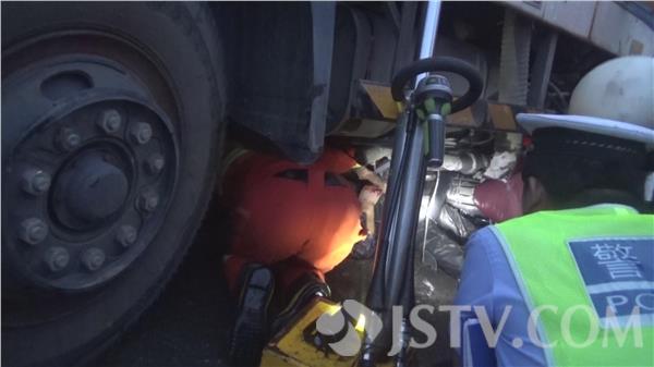 记者到场时发现,事故现场一辆环卫清扫车正横停在路上,在车身左侧底部压着一辆摩托车,清扫车的水管由于猛烈的撞击发生破裂,正不停的向外冒水。摩托车驾驶员的腰部以前被摩托车死死压住动弹不得,驾驶员面部满是血迹,但该驾驶员意识仍然清醒并不停地呼救。消防官兵到场后迅速利用液压顶杆将清扫车左侧车身顶起,但由于清扫车内满载着5吨水无法完全顶起,随后消防员钻进车底将摩托车抬起,经过消防官兵15分钟的紧急救援将伤者救出,早已等候的医护人员赶紧将他送到附近医院治疗。