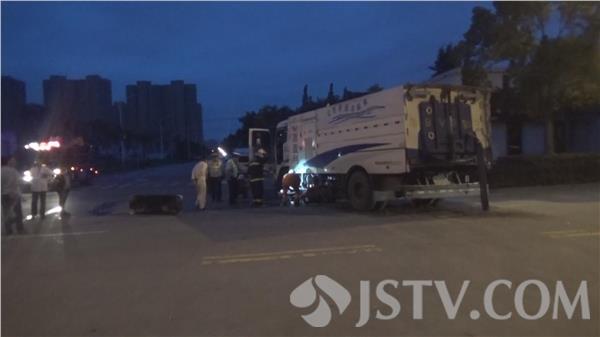 据清扫车驾驶员介绍,当天凌晨4时左右他正如往日一样在中山路进行清扫工作,当从中山路向左转向绿杨路时,后方一辆同向行驶的摩托车突然撞上左侧车身并滑进车底,于是驾驶员迅速下车查看并报警。
