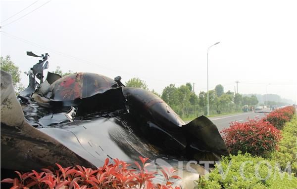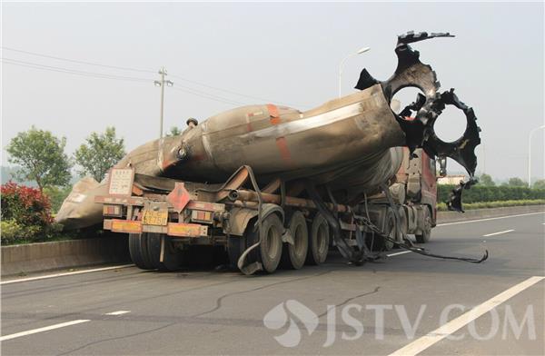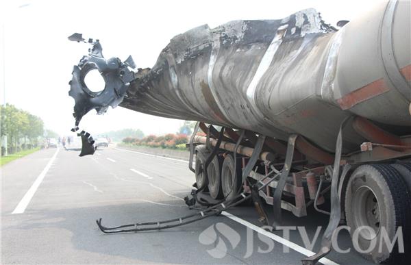 今天(7月14日)下午2点多钟,荔枝新闻记者接到信息:在326省道盐城响水县南河镇境内一辆油罐车发生爆炸。随后,记者赶到现场,在326省道南河镇境内义新河东侧约100米处,一辆炸毁的油罐车停在路的左侧,交警正在现场调查了解情况,现场100米以外仍能看到爆炸飞溅出去的碎片,可见爆炸的威力不小。