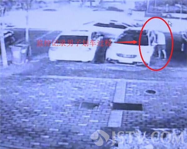 车辆停好后,男子下车看了下,由于傍边有人,男子并没有动手,等傍边的群众离开后,男子首先走到赵先生车子的后面,用钥匙之类的硬物开始划车,随后又到车子的侧面继续划车,然后离开了现场。估计是害怕被人怀疑,几分钟后,男子再次返回到现场,将自己的车辆开走,停放在傍边不远的地方。过了一会又再次返回,继续划赵先生的车辆。整个过程被监控清楚的记录下来。