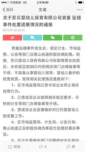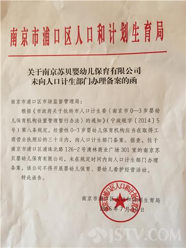 根据检查相关情况,浦口区计生局通过官方微博发布了“关于苏贝婴幼儿暴雨有限公司男童坠楼时间处置紧张情况的通报”,其中表示,由浦口区市场监管局责令该企业停止相关经营行为。目前该机构仍然有20多名幼儿已经签订了相关托管协议,计生部门要求机构做好妥善安置工作。