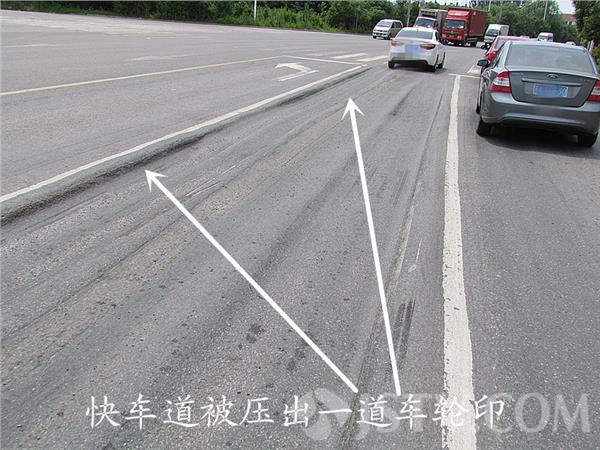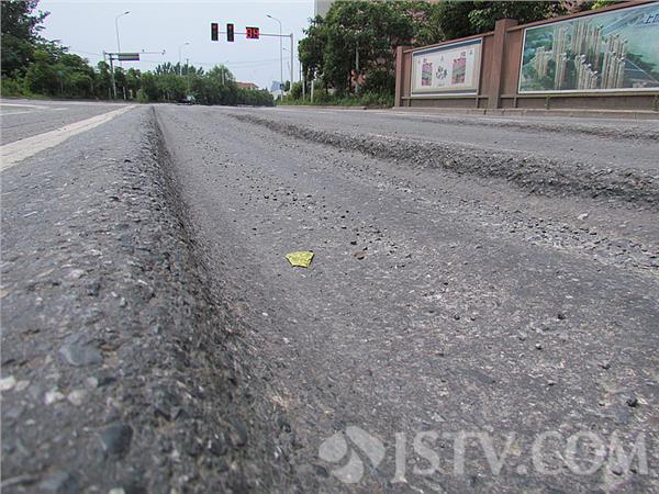 笔者在南京江宁万安北路一路口,在连日高温与车辆的双重压力下,直行车道柏油路面严重凹陷,柏油路面形成一个“U”型,成了沟沟坎坎,最深处有10厘米左右。由于路面高低不平,在这段道路上减速等红灯的车辆,司机们总是小心翼翼地沿着“沟壑”的方向前进,“这哪是路,简直就是火车轨道”。