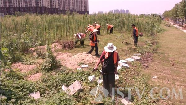 今天上午记者再次来到了南京的青奥村,现场可以看到有七八名的园林工人在对这里的杂草进行处理,一是工人是采用镰刀割的方式进行清理,还有有两台除草机在对这个草坪进行一个修剪。